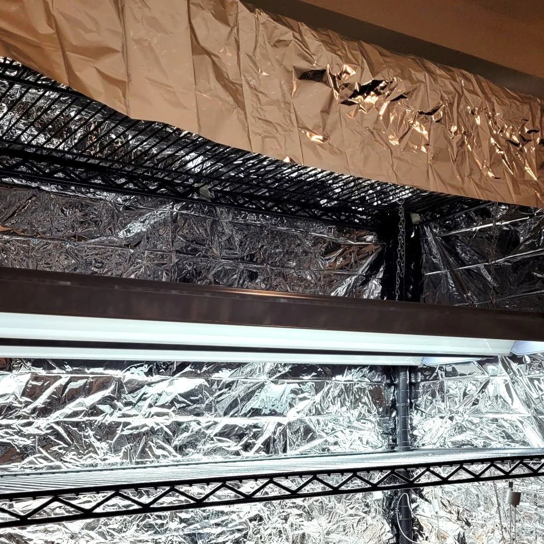 Mylar film is optional but I’ve found it to be a game changer. I wrap the wire rack with the mylar on the back, sides, and bottom of each shelf to reflect the light given off by the grow lights. The result is healthy, lush plants that aren’t leggy or grow in one direction.