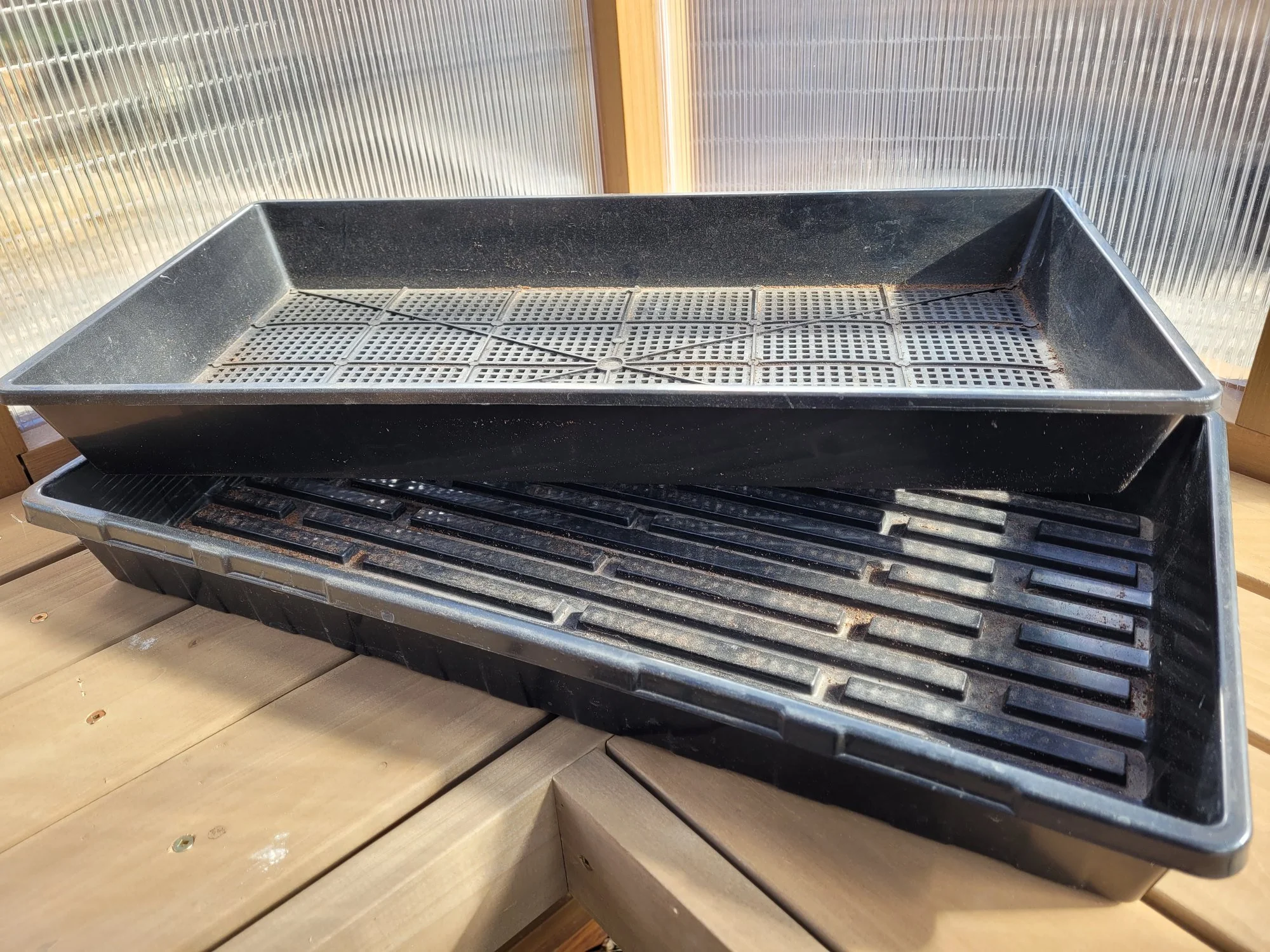My well-used (and dirty) 1020 tray with holes & 1020 tray without holes from Bootstrap Farmer.